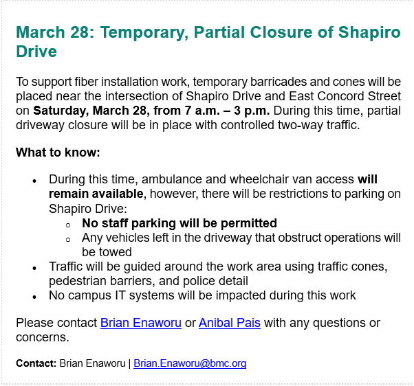 BMC SHAPIRO DRIVE CLOSURE MARCH 28, 2026