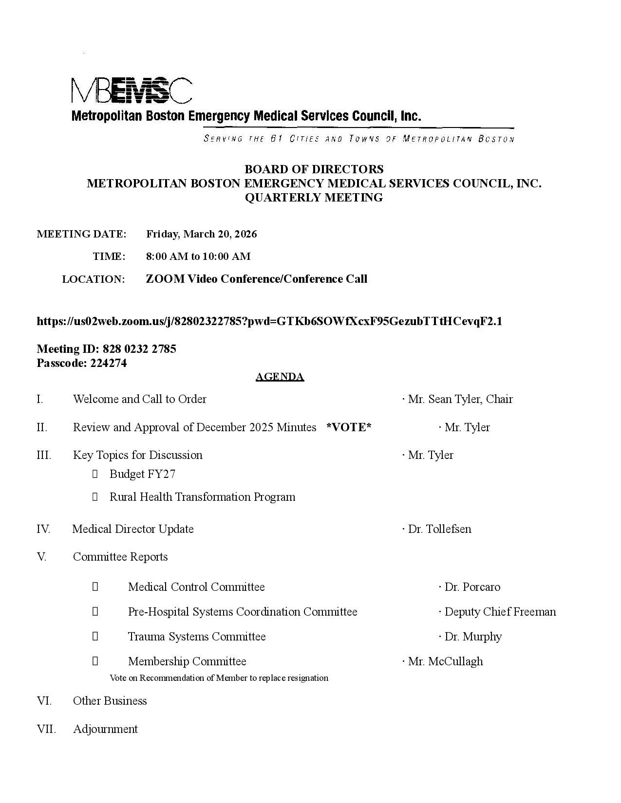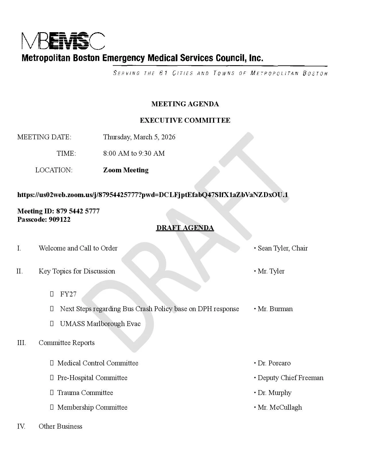 You can download the Agenda for the Executive Committee Zoom meeting scheduled for Thursday, June 5, 2025 beginning at 8:00 AM, as well as a link below to an article regarding funding for the EMS system and Regions in MA on NBC talking to Senator Tarr. Please let me know whether or not you will be attending this meeting.